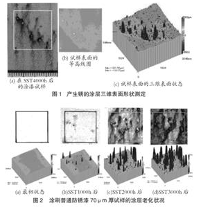 在腐蝕與防腐蝕技術(shù)教育過程中,為有助于設(shè)備維護(hù)人員對涂層老化現(xiàn)象的把握,采用鹽水噴霧試驗法(下稱“SST”)來加速試樣涂層的腐蝕速度,并采用表面形狀三維計測技術(shù)對腐蝕狀況進(jìn)行計測試驗。測定裝置由激光距離儀和XY工作臺構(gòu)成。圖1示出該測定裝置的測定結(jié)果。圖1(a)表示試樣可測定的范圍,(b)和(c)表示采用表面形狀三維計測技術(shù)獲得的涂層表面的等高線圖和俯視圖。由圖可知,在(a)圖中看到的黑點銹就是在(b)和(c)圖中鼓起高度達(dá)數(shù)百微米的黑點。圖2用照片和三維俯視圖示出SST隨時間變化產(chǎn)生銹的狀況。根據(jù)這些測定結(jié)果可知,所謂涂層老化現(xiàn)象是指涂料在涂層表面發(fā)生鼓起后慢慢增大,不久便從鼓起的前端產(chǎn)生流銹,然后污損周圍這樣一個過程。由于涂層會從鋼表面剝落,因此鼓起的涂料內(nèi)部會成為不利于防腐的部分。鼓起的涂料內(nèi)部產(chǎn)生的腐蝕被稱為“涂層下的腐蝕”,由此產(chǎn)生的銹和銹汁會導(dǎo)致流銹的產(chǎn)生。