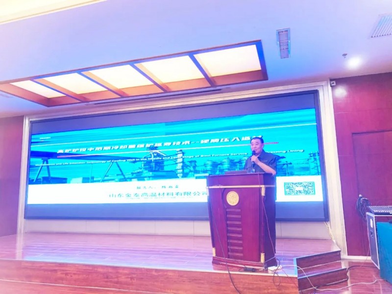 山東金泰高溫材料有限公司總工陳新貴作《高爐爐役中后期冷卻壁維護延壽技術(shù)--硬質(zhì)壓入造襯》主題報告