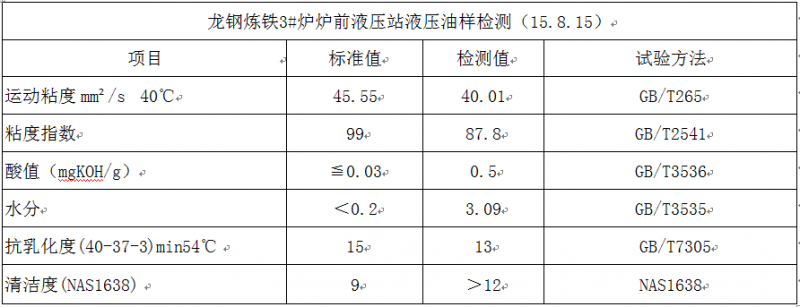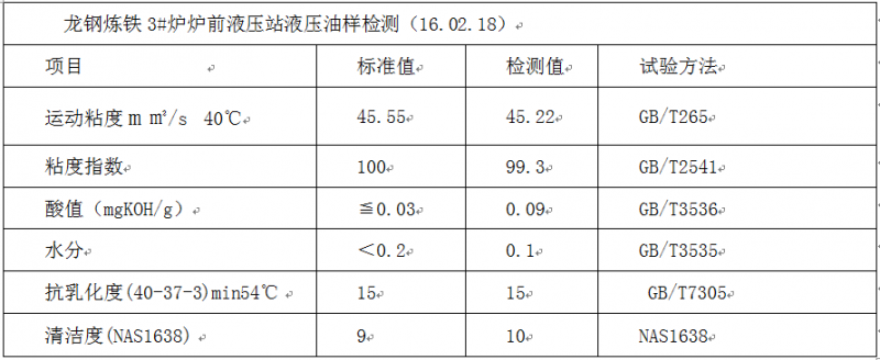 通過以上全方位探索、改造與管理,煉鐵3#爐爐前液壓站從15年9月2日更換液壓油以來,該站液壓油已安全運行4個多月,檢驗各項指標(biāo)檢測合格,具體效果見下表: