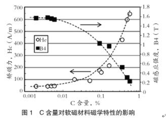 具有強(qiáng)磁性磁矩的主要組織是體心立方結(jié)構(gòu)的鐵素體相。雖然斜方晶系結(jié)構(gòu)的滲碳體也是強(qiáng)磁體,但其磁矩遠(yuǎn)小于鐵素體,并且對磁性還有不利影響。所以材料的C含量對軟磁材料的磁學(xué)特性有顯著影響。