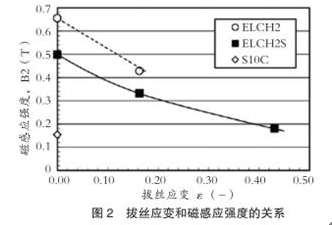 圖2是拔絲應(yīng)變與磁感應(yīng)強(qiáng)度的關(guān)系。隨著應(yīng)變量的增加,各鋼的磁感應(yīng)強(qiáng)度都下降,但開發(fā)鋼ELCH2S在應(yīng)變ε=0.43的情況下,磁感應(yīng)強(qiáng)度仍高于未加工的S10C。在未磁場退火的鍛造狀態(tài)下使用本開發(fā)鋼,可以提高電磁控制元件的功能。
