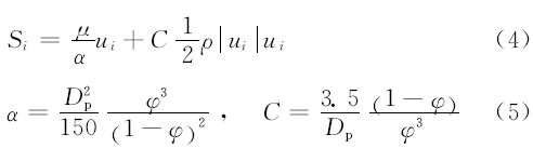 式中:α、C 分別為滲透系數(shù)和慣性力系數(shù);Dp和φ分別為死料柱內(nèi)焦炭顆粒的平均直徑和死料柱孔隙度;p 為壓力項(xiàng);ρ、μ分別為平均密度和分子黏性系數(shù);σk 、σε分別為k 和ε的普朗特?cái)?shù),σε =1.3;t為時(shí)間;ui 、xi分別為速度分量和坐標(biāo)分量,i=1、2、3即{xi =x,y,z},{ui =u,v,w };j 為求和下標(biāo);Pk為湍動(dòng)能生成項(xiàng),Pk =