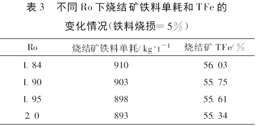 參照武鋼燒結(jié)礦的質(zhì)量要求和原料條件,可計算出在鐵料燒損一定時, 燒結(jié)礦不同Ro 時的鐵料單耗。表3 是鐵料燒損為5 %時, 不同Ro 下燒結(jié)礦鐵料單耗和TFe 的變化情況。