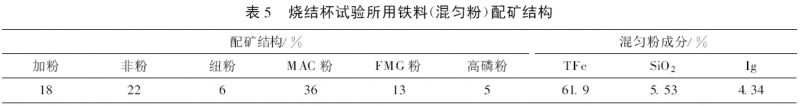 燒結(jié)杯試驗所用混勻粉配礦結(jié)構(gòu)及各原料化學(xué)成分見表5 、表6 。