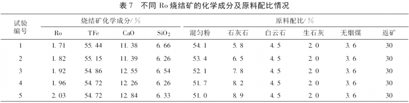 3.3 不同Ro 燒結(jié)礦的化學(xué)成分及原料配比