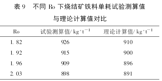用試驗所用混勻粉做燒結(jié)礦鐵料單耗理論計算, 并與試驗測算值對比, 結(jié)果見表9 所示。