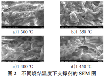 圖2 是不同燒結(jié)溫度制備的支撐劑的SEM 掃描電鏡分析。由圖2 可知,1300 ℃( 如圖2a) 所示) 燒結(jié)的支撐劑主要以針狀的莫來(lái)石結(jié)構(gòu)為主,針狀莫來(lái)石相互交叉,出現(xiàn)大量的顯氣孔,中間彌散分布有少量的方石英。1 350 ℃( 如圖2b) 所示) 燒結(jié)的陶粒支撐劑顯微形貌中針狀莫來(lái)石開(kāi)始逐漸變粗,但相對(duì)看起來(lái)還比較粗短,此時(shí)氣孔還相對(duì)較多,在此燒結(jié)溫度下,開(kāi)始逐漸出現(xiàn)少量液相。繼續(xù)升高燒結(jié)溫度至1 400 ℃( 如圖2c) 所示) ,莫來(lái)石相不斷變粗,變?yōu)楸容^長(zhǎng)的棒狀。從圖2c) 中可以看出,1400 ℃燒結(jié)的陶粒支撐劑,燒結(jié)過(guò)程中產(chǎn)生的液相填充了顆粒間的氣孔和間隙,使得結(jié)構(gòu)最為致密。燒結(jié)溫度再升高到1 450 ℃( 如圖2d) 所示)時(shí),大量的液相把莫來(lái)石和方石英緊緊包裹在一起,同時(shí)出現(xiàn)比較大的閉氣孔,不利于結(jié)構(gòu)致密。