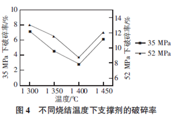 試樣的抗破碎能力是指在一定壓力下對(duì)一定體積的支撐劑進(jìn)行抗壓測(cè)試,用破碎率的高低來(lái)反映支撐劑的強(qiáng)度大小,不同的油氣井對(duì)支撐劑的破碎率要求不同,對(duì)于深層油氣井來(lái)說(shuō),就要求支撐劑有較高的抗閉合能力。圖4 是不同燒結(jié)溫度所制成的陶粒支撐劑在35 MPa,52 MPa 閉合壓力下的破碎率。從圖4中可以觀察到,在35 MPa 和52 MPa 閉合壓力下,1300 ℃燒結(jié)的陶粒支撐劑破碎率分別為7. 18% 和12. 99%,主要是與莫來(lái)石的針狀結(jié)構(gòu)和大量氣孔有關(guān)。隨著燒結(jié)溫度的升高,破碎率逐漸降低,主要是由高溫出現(xiàn)的液相使得結(jié)構(gòu)致密所致。當(dāng)燒結(jié)溫度達(dá)到1 400 ℃ 時(shí),陶粒的破碎率達(dá)到最低值,分別為2. 86% 和8. 72%,與SEM 的分析結(jié)果一致,此時(shí)的結(jié)構(gòu)最為致密,莫來(lái)石呈現(xiàn)棒狀結(jié)構(gòu),滿(mǎn)足行業(yè)標(biāo)準(zhǔn)的要求。燒結(jié)溫度繼續(xù)升高至1 450 ℃時(shí),陶粒的破碎率分別上升為6. 13%和12. 05%,這可能是與產(chǎn)生的閉氣孔有關(guān),不滿(mǎn)足行業(yè)標(biāo)準(zhǔn)要求。由此可知,陶粒支撐劑的最佳燒結(jié)溫度為1 400 ℃。