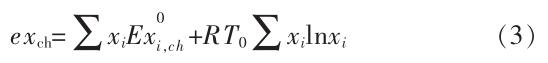 式( 2 )中:H和S分別表示物質(zhì)在實(shí)際條件下(T,P)的特定摩爾焓和熵,H0和S0表示物質(zhì)在參考環(huán)境條件下(T0,P0)的特定摩爾焓和熵.氣體混合物的化學(xué)火用可以用式(3)來(lái)計(jì)算:
