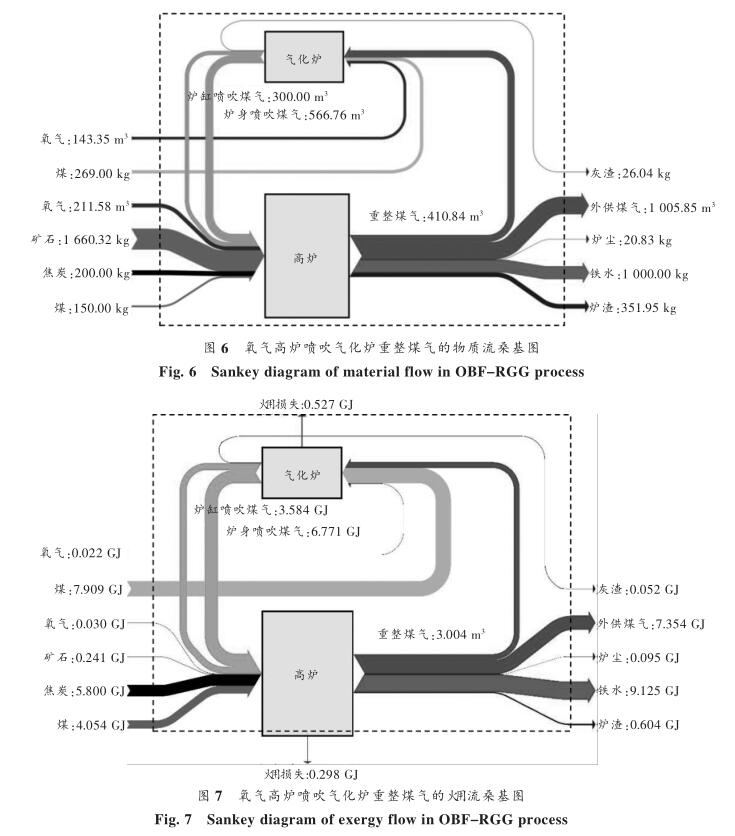 文中對(duì)比了傳統(tǒng)高爐工藝和氧氣高爐噴吹氣化爐重整煤氣工藝的物質(zhì)流和火用流結(jié)構(gòu).由于工藝結(jié)構(gòu)的變化,OBF-RGG工藝和TBF工藝的物質(zhì)流平衡存在較大差異.物質(zhì)流輸入方面:OBF-RGG工藝高爐單元的燃料比相比TBF工藝減少了33%,但是爐外重整煤氣需要額外消耗269 kg/t的煤,因此OBF-RGG工藝的燃料比高于TBF工藝;物質(zhì)流輸出方面:盡管OBF-RGG工藝的爐頂煤氣少于TBF工藝,但是OBF-RGG工藝的外供煤氣量比TBF工藝還要多74.11 m 3 /t,而且其熱值高達(dá)7271 kJ/t.