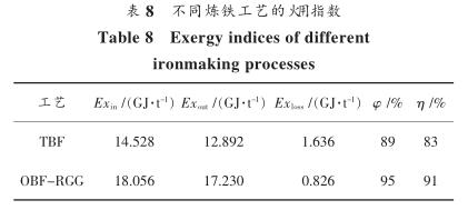 基于物質(zhì)平衡的變化,高爐煉鐵系統(tǒng)的火用損失、火用效率和熱力學(xué)完善度等火用指數(shù)也發(fā)生了變化 , 如表8所列為不同煉鐵工藝的火用指數(shù).OBF-RGG工藝相比于TBF工藝,高爐煉鐵系統(tǒng)的火用輸入和火用輸出均增加,主要因?yàn)榻固俊⒚悍酆兔簹庾鳛槿剂暇哂休^高的火用值,OBF-RGG工藝中氣化爐重整和加熱煤氣的過(guò)程需要額外消耗煤和氧氣,同時(shí)外供大量高熱值煤氣;然而OBF-RGG工藝的火用損失減小,相比于TBF 工藝減少了49.5 %,主要因?yàn)楦郀t單元中循環(huán)煤氣的利用,代替了固體燃料還原鐵礦石的過(guò)程,減少了固體燃料向氣體燃料轉(zhuǎn)變過(guò)程中的火用損失.相應(yīng)地,隨著高爐煉鐵系統(tǒng)內(nèi)部煤氣的循環(huán)利用,OBF-RGG工藝的熱力學(xué)完善度和火用效率都得到了明顯的提高。