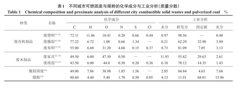 不同城市可燃固廢的化學(xué)成分與工業(yè)分析(質(zhì)量分?jǐn)?shù))見表1。