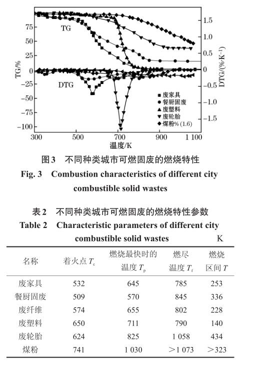 城市可燃固廢的著火點(diǎn)都低于煤粉,其中餐廚固廢的著火點(diǎn)最低,廢塑料的著火點(diǎn)最高;城市可燃固廢的燃燒速度最快時的溫度也低于煤粉,餐廚固廢的燃燒速度最快時的溫度最低,廢輪胎的燃燒速度最快時的溫度最高;城市可燃固廢的燃盡溫度也低于煤粉,廢家具的燃盡溫度最低,廢輪胎的燃盡溫度最高。