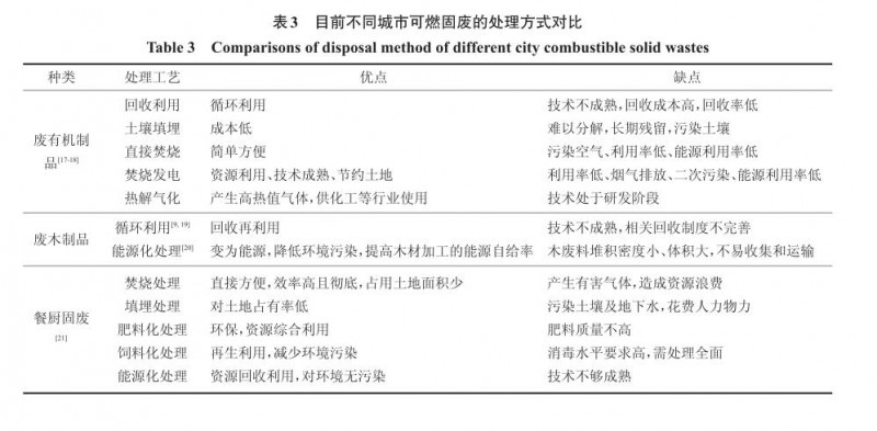 城市可燃固廢的處理方式很多,見表3。廢有機(jī)制品處理的方法主要分為5種:直接焚燒、焚燒發(fā)電、熱解氣化、填埋和回收再利用。采用焚燒處理,廢塑料燃燒會產(chǎn)生大量熱量,難以有效利用,利用率只有30%,會造成資源的浪費(fèi),并且燃燒過程中