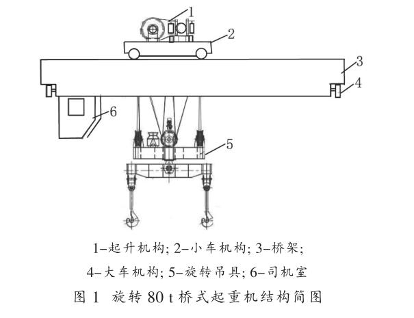 通過4套鋼繩將旋轉吊具與爐前80 t 起重機主小車連接起來, 旋轉時通過主小車上的導向輪引導鋼繩。 在吊卸廢鋼槽作業(yè)時,操作吊車起升機構完成廢鋼槽升降,通過“旋轉啟動按鈕”控制旋轉吊具上的旋轉電機正向或反向運行, 在旋轉電機的驅動下使旋轉吊具旋轉, 從而實現(xiàn)廢鋼槽水平方向360°范圍內任意角度擺放。 圖1為旋轉80 t 橋式起重機結構簡圖, 圖2為旋轉80 t橋式起重機主小車機構結構簡圖。