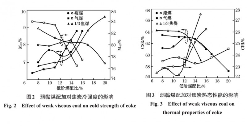 寬炭化室、多段加熱的大容積焦?fàn)t工藝技術(shù)實(shí)現(xiàn)了以下功能:(1)燃燒室采用3段式加熱方法,實(shí)現(xiàn)高向均勻加熱。炭化室高向溫度差在50 ℃以內(nèi),長(zhǎng)向均勻系數(shù)大于0.9,氮氧化物排放量降低至450 mg/m 3(標(biāo)準(zhǔn)態(tài))以下,解決了爐頂空間溫度高、化產(chǎn)收率低的技術(shù)難題;(2)采用節(jié)能型焦?fàn)t蓄熱室封墻,有效提高了爐體密封性;采用新型格子磚,提高了預(yù)熱煤氣和空氣的溫度;(3)通過建立煤氣流量、標(biāo)準(zhǔn)溫度、空氣過剩系數(shù)、煤氣熱值與焦?fàn)t溫度的關(guān)系模型,確定了不同結(jié)焦時(shí)間的最低標(biāo)準(zhǔn)溫度,實(shí)現(xiàn)噸焦煤氣耗量降低至195 m 3(標(biāo)準(zhǔn)態(tài))以下;(4)通過煤種配煤優(yōu)化試驗(yàn)和低價(jià)煤極限配加試驗(yàn),確定了典型的氣煤、1/3焦煤和瘦煤的極限配加比例(圖2、圖3),進(jìn)而得到適合寬炭化室7 m焦?fàn)t的合理配煤結(jié)構(gòu)。弱黏煤配比達(dá)到44.1%,焦炭的M 40 、M 10 和CSR分別達(dá)到90.24%、5.97%和68.14%,滿足了大高爐煉鐵的要求。