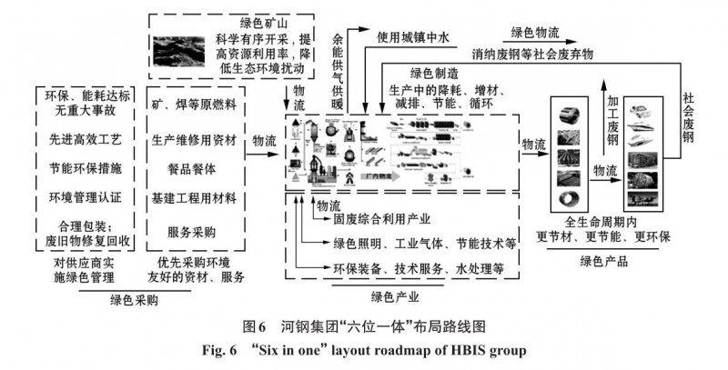 河鋼集團(tuán)圍繞“建設(shè)最具競(jìng)爭(zhēng)力鋼鐵企業(yè)”的目標(biāo),在國(guó)內(nèi)率先提出“六位一體”總布局的綠色發(fā)展戰(zhàn)略(圖6),深入推進(jìn)綠色制造、加快發(fā)展綠色產(chǎn)業(yè)、研發(fā)應(yīng)用綠色產(chǎn)品、穩(wěn)步推進(jìn)綠色采購、系統(tǒng)優(yōu)化綠色物流、培育打造綠色礦山,確保使集團(tuán)所有子公司率先成為效益佳、效率高、消耗低、排放少、環(huán)境美的綠色鋼鐵示范企業(yè),繼續(xù)引領(lǐng)中國(guó)鋼鐵行業(yè)綠色轉(zhuǎn)型[26]。