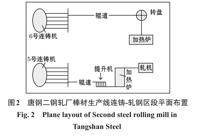 唐鋼二鋼軋廠棒材生產(chǎn)線有5號、6號兩臺連鑄機,5號連鑄機與加熱爐成水平分布,但不在同一水平面上,鑄坯經(jīng)輥道輸送后需通過提升機提升到入爐輥道;6號連鑄機與加熱爐成90°分布,鑄坯通過輥道先送至轉(zhuǎn)盤,通過轉(zhuǎn)盤旋轉(zhuǎn)90°后運至加熱爐,平面布置如圖2所示。