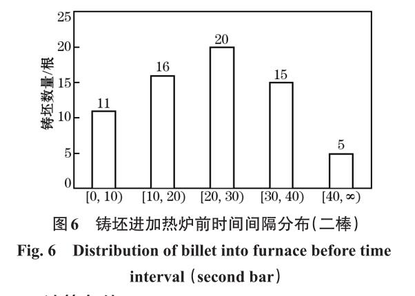 在入爐前設(shè)置一個測溫點,并且記錄下每根鑄坯到達加熱爐前的時間,就能計算出相鄰鑄坯到達加熱爐的時間間隔,統(tǒng)計結(jié)果如圖5和圖6所示。