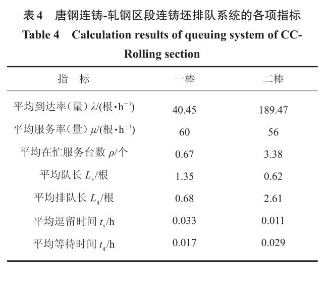 根據(jù)表3中的計算條件,通過排隊理論可計算得到唐鋼二鋼軋廠連鑄-軋鋼區(qū)段鑄坯排隊過程的相關(guān)指標,結(jié)果見表4。