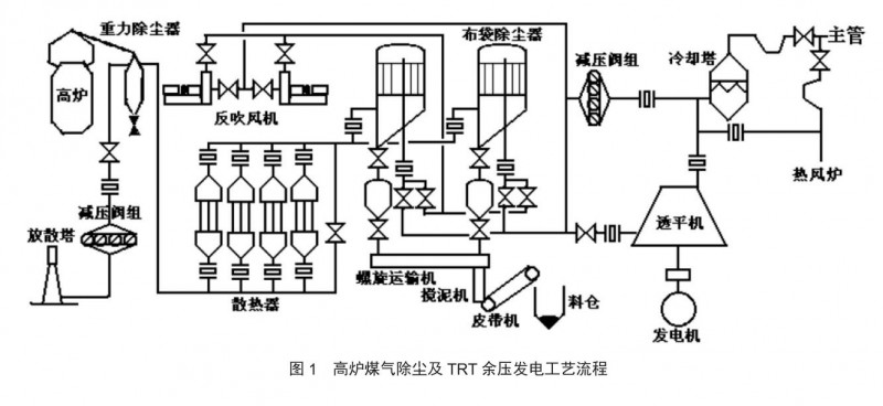 攀鋼釩公司現(xiàn)有5座高爐,容積分別為 1200m33座,1350m31座,2000m31座,年產(chǎn)生鐵約600萬t。5座高爐均采用高爐煤氣干式布袋除塵技術(shù),布袋除塵效率高達(dá) 99%以上,除塵后煤氣物理顯熱較高,配合 TRT機(jī)組可顯著提高余熱發(fā)電量。高爐煤氣布袋除塵發(fā)電工藝:高爐荒煤氣由重力除塵器(DC)進(jìn)行粗除塵后,通過兩組列管式散熱器進(jìn)行降溫控制(出口煤氣溫度小于 200 ℃);然后由布袋除塵筒體(BDC)進(jìn)行進(jìn)一步精除塵,精除塵后凈煤氣(含塵量小于 3 mg/m3)進(jìn)入 TRT 透平機(jī)發(fā)電,或經(jīng)凈煤氣減壓閥組減壓后進(jìn)入后部高爐煤氣主管。