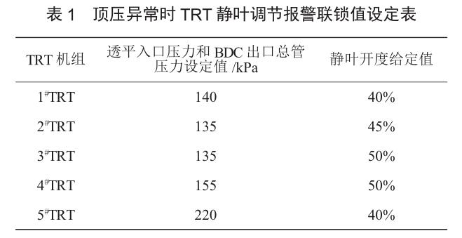 增設(shè)透平入口壓力和 BDC 出口總管壓力(兩點(diǎn))與 TRT 靜葉聯(lián)鎖調(diào)節(jié)程序:當(dāng)透平入口壓力和BDC 出口總管壓力兩點(diǎn)同時(shí)高于設(shè)定值時(shí),發(fā)出聲光報(bào)警,且靜葉調(diào)節(jié)退出自動(dòng)模式,轉(zhuǎn)為手動(dòng)模式,同時(shí)靜葉開度自動(dòng)調(diào)整到給定值。5 臺(tái) TRT機(jī)組具體設(shè)定值如表 1。