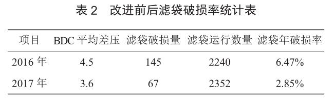 (3)與布袋生產(chǎn)廠家進(jìn)行溝通,優(yōu)化布袋易損部位縫制工藝質(zhì)量,降低布袋反吹破損率。并結(jié)合每周2 次 BDC 筒體煤氣粉塵人工取樣檢測(cè),有效監(jiān)控布袋改進(jìn)后的除塵系統(tǒng)運(yùn)行質(zhì)量。