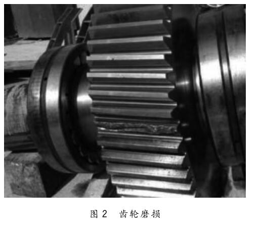 機(jī)械設(shè)備的磨損也是導(dǎo)致軋鋼設(shè)備出現(xiàn)振動(dòng)的重要原因。設(shè)備在工作時(shí),用于傳動(dòng)的關(guān)鍵零件的磨損會(huì)嚴(yán)重影響機(jī)械設(shè)備的運(yùn)轉(zhuǎn)平穩(wěn)性,如軸承和齒輪的磨損。軸承是設(shè)備旋轉(zhuǎn)過程中的關(guān)鍵零件,但由于負(fù)載和工作環(huán)境的影響,導(dǎo)致軸承發(fā)生磨損和變形,如圖 1 所示,軸承的滾珠和滾子在軸承內(nèi)圈和外圈中的運(yùn)動(dòng)位置發(fā)生變化,在傳動(dòng)過程中出現(xiàn)回轉(zhuǎn)精度低,運(yùn)轉(zhuǎn)出現(xiàn)振動(dòng)。如圖2所示,齒輪的磨損,導(dǎo)致減速器在運(yùn)轉(zhuǎn)時(shí)內(nèi)部嚙合傳動(dòng)的齒輪出現(xiàn)傳動(dòng)精度偏差,無法保持平穩(wěn)性,設(shè)備的振動(dòng)隨著傳動(dòng)鏈從動(dòng)力源到執(zhí)行件不斷被放大,導(dǎo)致軋鋼設(shè)備在末端執(zhí)行位置時(shí)的振動(dòng)現(xiàn)象尤為明顯。