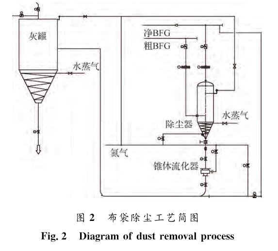 輸灰方式采用氣力密閉輸灰,在輸灰系統(tǒng)中設置了凈高爐煤氣或氮氣作為輸灰的輸送氣體,通過控制閥門進行切換。輸灰氣體的壓力為0.2MPa,輸送速度為8~15m/s,灰氣混合質量比為20~30,輸送能力為30t/h。布袋除塵灰量每天約200t,灰罐能力按每天輸灰2次考慮。