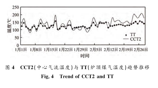 高爐爐頂溫度是高爐煤氣與爐料熱交換的結果,是煤氣利用好壞的直接體現,合理的頂溫有利于提高高爐內部的熱量利用效率,從而降低燃料消耗。高爐煤氣的溫度是影響布袋壽命的主要因素。煤氣溫度低于露點會導致糊袋、反吹效果差,最終使布袋受壓變形、破損;煤氣溫度高于布袋最大允許工作溫度會燒壞布袋[10]。因而,在實際生產過程中,頂溫一般按120~250 ℃ 控制。當頂溫連續(xù) 3h 低于120℃時,布袋壓差就會明顯上升,此時一般有以下幾種措施可以采取:(1)減氧。減氧使風口前理論燃燒溫度降低,單位生鐵的爐腹煤氣量增加。減氧后爐內高溫區(qū)上移,水當量升高,加熱同樣質量、溫度的爐料后,爐頂煤氣溫度上升。減氧后煤氣流到達塊狀帶區(qū)域的時間縮短,上部熱交換時間變短,換熱不充分,導致煤氣利用率下降,燃料比升高,產量被迫減少。這都與煉鐵方針相違背。(2)氣流調整。由于爐頂溫度與中心氣流強度呈較強的正相關性,因此嘗試通過提高中心氣流來提高爐頂溫度,包括調整布料平臺的寬度和角度等,礦石檔位由(234567-433222)調整為(234567-433221),焦炭檔位由(234567-433222)調整為(2345678-4332222),溜槽傾角整體向邊緣推進0.5° 在 2016 年 2 月 10 日采取上述措施后取得了不錯的效果(圖 4 ),頂溫的強度和穩(wěn)定性都得到了提高。