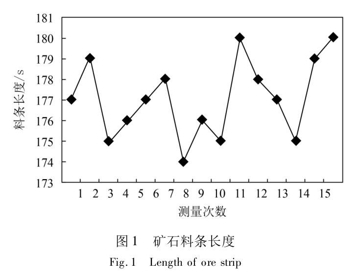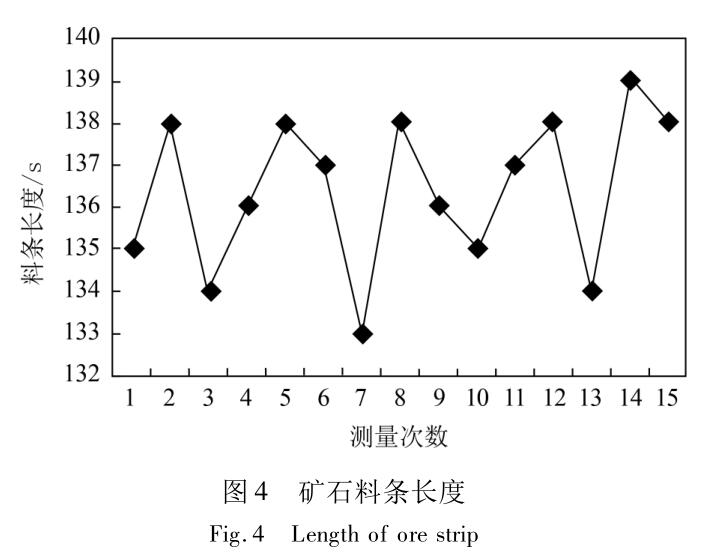 針對(duì)上述改造方案,對(duì)我廠 B 高爐逐步進(jìn)行改造,首先調(diào)整燒結(jié)礦排料間隔時(shí)間,現(xiàn)場(chǎng)將 2A -10A 共9 個(gè)倉縮短2 s 時(shí)間,現(xiàn)場(chǎng)測(cè)試料條效果較明顯。實(shí)測(cè)現(xiàn)場(chǎng)礦石物料基本頭尾相接無明顯空擋,但在連接處仍有窄料條。隨即將時(shí)間再次調(diào)整 1 s,測(cè)試現(xiàn)場(chǎng)物料基本按要求重疊且料條寬度基本一致,已達(dá)到預(yù)期效果。焦炭倉將現(xiàn)場(chǎng)閘門開度調(diào)整到最大后,將 8B - 2B 共 7 個(gè)倉間隔時(shí)間縮小 3 s,并記錄 15 批時(shí)間。實(shí)側(cè)平均料條長(zhǎng)度為 14. 1 s,礦石長(zhǎng)度為 136. 4 s,詳見圖 3、圖 4。