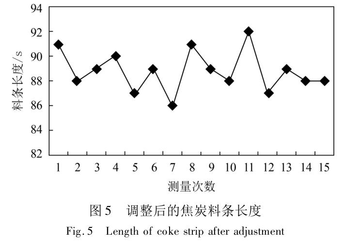焦炭在第一次調(diào)整后皮帶物料基本頭尾相接,料寬基本一致;但焦炭在皮帶上料層厚度仍有調(diào)整余地,按預(yù)定方案將焦炭分料種平鋪。經(jīng)過第二次調(diào)整后測(cè)試15 批物料,實(shí)測(cè)料條長(zhǎng)度降為88. 4s,效果顯著,如圖 5 所示。
