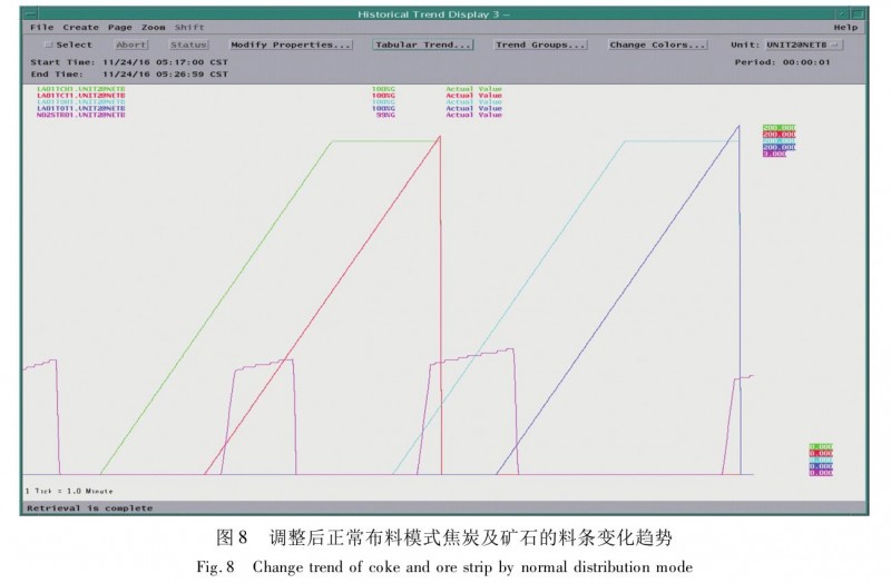 調(diào)整后因高爐爐況波動(dòng)曾出現(xiàn) 1 次較大的塌料,其中最深尺料線達(dá) 4. 3 m。按調(diào)整前上料能力需近2 h 可恢復(fù)料線,實(shí)際僅經(jīng)1 h 15 min 即達(dá)到設(shè)定料線。同時(shí),2016 年 11 月開始測(cè)試分割布料,即C /O /O 布料模式(即焦/礦1/礦2 ),此種情況下較前每批上料多 1 批礦石(圖 6 ~ 8)。之前上料能力無法滿足基本上料,在調(diào)整后滿足了生產(chǎn)工藝要求。