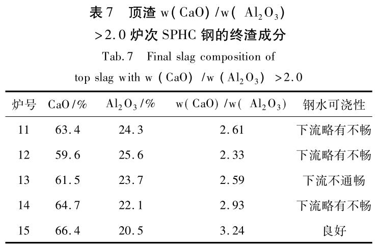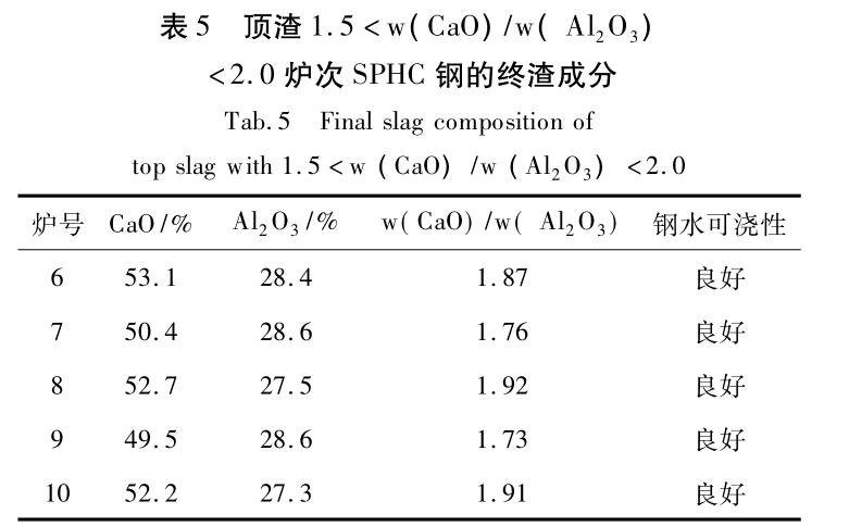 本次試驗使用鋼種為 SPHC,試驗 15 爐次。將此 15 爐 次 根 據(jù) 精 煉 爐 頂 渣 中 不 同 w ( CaO ) /w( Al2O3) 分為3個對比組,主要研究精煉頂渣中不同w( CaO) /w( Al2O3 )對鋼水可澆性和脫硫效果的影響。SPHC 鋼種成分如表 1 所示。