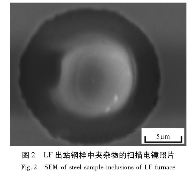 另外,CaO 的活度高,在頂渣中 CaO 可以電離出大量鈣離子。鈣離子擴(kuò)散到鋼液中可以和 MgO·Al2O3 尖晶石反應(yīng)生成低熔點的 CaO·MgO·Al2O3復(fù)合型非金屬化合物。經(jīng)許多冶金工作者發(fā)現(xiàn),要想實現(xiàn) MgO·Al2O3尖晶轉(zhuǎn)變成低熔點的CaO·MgO·Al2O3復(fù)合型非金屬化合物,只需要很少的鈣離子就可以完成轉(zhuǎn)變。如果鈣離子過多,鈣離子會把 CaO·MgO·Al2O3中的 MgO 還原,生成 CaO·Al2O3化合物,CaO·Al2O3同樣是高熔點化合物,也會導(dǎo)致鋼水可澆性差。所以頂渣中的w( CaO) /w(Al2O3) 不宜太高,也不宜太低。經(jīng)試驗,w( CaO) /w( Al2O3) 控制在1.5~2.0比較合適。如圖 1、圖 2 所示為優(yōu)化后鋼樣中夾雜物的掃描電鏡照片及能譜分析結(jié)果,優(yōu)化后的夾雜物得到了很好變性,尺寸較小、形狀較規(guī),并且是為復(fù)合型夾雜,熔點較低,易于上浮去除。