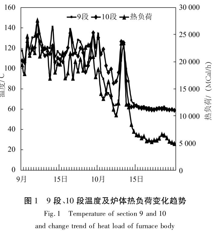 2017 年 9 月初配合鋼軋廠年修,高爐系統(tǒng)、焦化系統(tǒng)聯(lián)合檢修,2#高爐減配干熄焦至 20%,燒結(jié) 1#機(jī)年修 11 天,期間配加落地?zé)Y(jié)礦 400 t/h,外進(jìn)焦炭質(zhì)量下降,灰分升高,入爐原燃料質(zhì)量下降。10月份后自產(chǎn)焦炭灰分也出現(xiàn)升高現(xiàn)象,風(fēng)量下降趨勢(shì)明顯,爐況穩(wěn)定性下降。至 10 月 14 日后風(fēng)壓升高,風(fēng)量萎縮,料尺動(dòng)作停止、滑落,出現(xiàn)懸料、崩料、偏尺,9 段、10 段溫度下降、呆滯,爐體熱負(fù)荷下降并低于10 000 MCal/h,順行程度變差,難于接受風(fēng)量、風(fēng)溫,調(diào)整上部裝料制度、大幅度減輕焦炭負(fù)荷,對(duì)邊緣、中心氣流進(jìn)行疏導(dǎo),效果不明顯。至此,爐墻結(jié)厚形成,由于長(zhǎng)期慢風(fēng)作業(yè),爐缸產(chǎn)生堆積。9段、10 段溫度和爐體熱負(fù)荷變化趨勢(shì)見(jiàn)圖 1,爐芯溫度變化見(jiàn)圖 2。