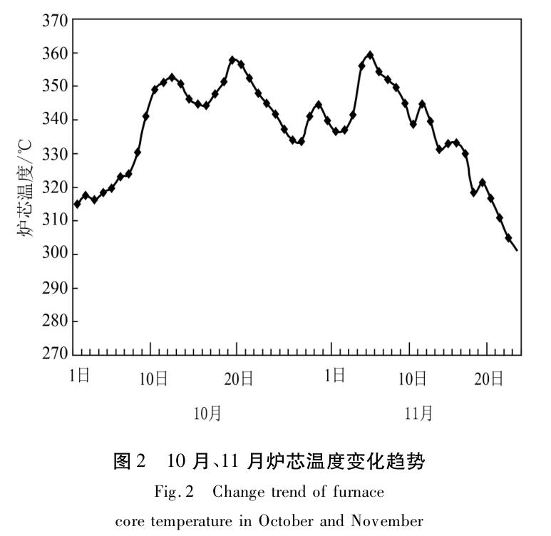 第二次集中加焦熱洗。10 月 26 日由于干熄焦數(shù)量不足,被迫配加高灰分的庫(kù)存干熄焦后,爐體溫度大幅下降,熱負(fù)荷水平下降至 4 500 MCal/左右,壓量關(guān)系不穩(wěn),出現(xiàn)懸料、崩料現(xiàn)象,用風(fēng)困難,風(fēng)量萎縮至 3 000 m3 /min 左右。