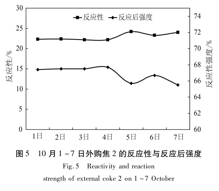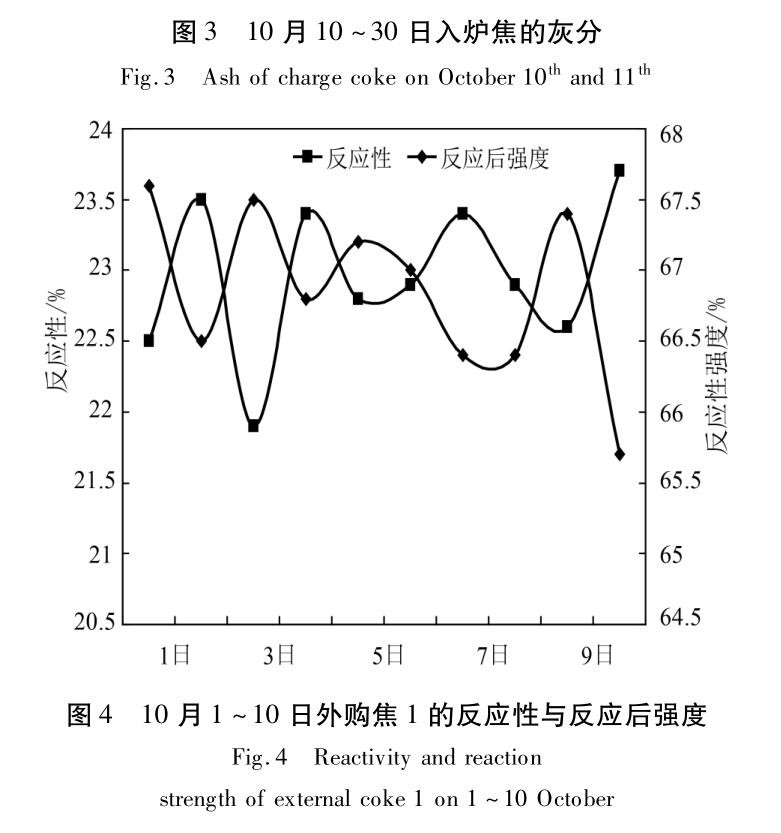 2#高爐正常的用焦結(jié)構(gòu)為自產(chǎn)干熄焦 60% +外購(gòu)焦 40%。聯(lián)合檢修期間,焦化廠改出濕熄焦,干熄焦配比減少至 20%。由于濕熄焦水分不穩(wěn)定、波動(dòng)較大,影響高爐熱制度的穩(wěn)定性,高爐順行程度下降,爐體熱負(fù)荷波動(dòng)大。同期自產(chǎn)焦炭、外購(gòu)焦灰分升高,外購(gòu)焦灰分由 12. 7% 升高至 15. 2%,10 月10 ~30 日焦炭灰分由 12. 8% 升高至 13. 2%,見(jiàn)圖3?;曳稚吆螅诟邷貭顟B(tài)下,灰分與角質(zhì)的膨脹性不同,灰分顆粒會(huì)產(chǎn)生裂紋,使焦炭高溫強(qiáng)度降低,10 月1 ~10 日外購(gòu)焦1、外購(gòu)焦2 熱性能見(jiàn)圖4、圖 5。高溫區(qū)焦炭骨架作用明顯降低,爐缸內(nèi)焦炭孔隙度下降,透氣性、透液性變差,長(zhǎng)期鼓風(fēng)動(dòng)能不足,爐芯溫度下降,爐缸堆積,入爐焦炭質(zhì)量劣化是爐墻結(jié)厚、爐缸堆積的主要原因[1] 。