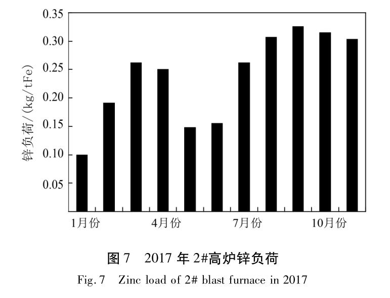 2017 年 2#高爐的鋅負(fù)荷逐漸增高,在 9 月份時(shí)達(dá)到峰值,遠(yuǎn)遠(yuǎn)高于《高爐煉鐵工程設(shè)計(jì)規(guī)范》( GB0427—015) 要求的 150 g /t。2017 年 2#高爐鋅負(fù)荷情況,如圖 7 所示。鋅礦物在高于高溫區(qū)被還原為氣態(tài)鋅,其沸點(diǎn)低( 905 ℃) ,部分鋅蒸氣隨煤氣排出爐外,大部分鋅與爐襯或爐料反應(yīng),在爐身下部甚至爐身上部形低熔點(diǎn)化合物,造成爐墻結(jié)厚甚至結(jié)瘤,或滲入爐襯的孔隙和磚縫中,氧化后引起爐襯膨脹而破壞爐殼[2]。鋅在高爐內(nèi)循環(huán)富集量越大,其危害性越大[3]。鋅負(fù)荷升高是爐墻結(jié)厚的重要原因[4]。