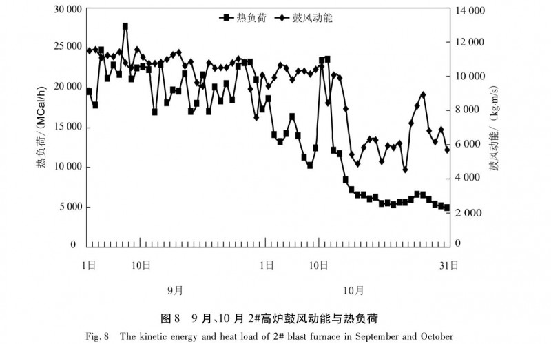 為了提高產(chǎn)量增加入爐風(fēng)量,2#高爐風(fēng)口面積擴(kuò)大至 0.332 1 m2 ,短期內(nèi)高爐產(chǎn)量得到提升。進(jìn)入 9 月份后,入爐原燃料質(zhì)量下降,邊緣氣流波動(dòng)大,風(fēng)量呈萎縮趨勢(shì),鼓風(fēng)動(dòng)能下降,10 月份后風(fēng)溫由 1 090 ℃下降至 1 040 ℃,鼓風(fēng)動(dòng)能進(jìn)一步降低,爐缸活躍度下降,中心氣流減弱,風(fēng)溫低軟融帶位置上移,以及爐體熱負(fù)荷波動(dòng)劇烈( 見(jiàn)圖 8) 。高溫局部氣流使高爐中部的爐料熔化后重新粘結(jié)在爐墻上,為中上部結(jié)厚提供了條件。在原燃料條件發(fā)生較大的變化后,對(duì)外圍變化對(duì)高爐的影響認(rèn)識(shí)不足,沒(méi)有根據(jù)外圍變化對(duì)高爐操作制度進(jìn)行調(diào)劑,是本次爐墻粘結(jié)的操作原因。