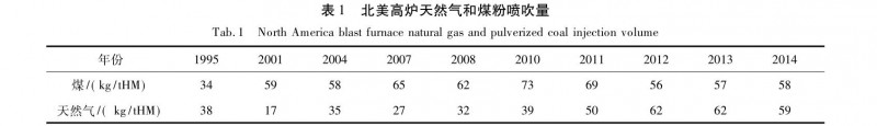 從 20 世紀(jì) 60 年代開始,北美高爐開始噴吹天然氣。從 1976 年到 1985 年,天然氣噴吹量緩慢增加。而 1985 年以后,由于頁巖氣技術(shù)的迅速發(fā)展,天然氣價(jià)格降低,高爐天然氣噴吹量大幅度增加。2011 年以后,平均噴吹量維持在 60 kg /tHM,如表 1所示[31] 。多座高爐生產(chǎn)實(shí)踐證實(shí),高爐混合噴吹天然氣和煤粉能夠改善爐內(nèi)反應(yīng)動(dòng)力學(xué)條件,降低爐缸熱波動(dòng),提高穩(wěn)定性和能量利用效率。目前,北美高爐混合噴吹煤和天然氣技術(shù)已成為發(fā)展趨勢。2014 年,天然氣平均噴吹量達(dá)到59 kg /tHM,煤比為58 kg /tHM。