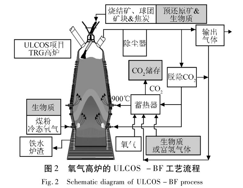 基于氧氣高爐的 ULCOS - BF 工藝是 ULCOS項(xiàng)目研發(fā)的重點(diǎn),其工藝流程如圖 2 所示。高爐爐頂煤氣被分成 CO2 富集煤氣和 CO 富集煤氣,CO富集煤氣返回到高爐作還原劑使用,CO2 富集煤氣經(jīng)過一次和二次除塵凈化和壓縮后,輸送到 CO2管網(wǎng)或 CO2 存儲器。目前,ULCOS-BF 工藝已開展多次試驗(yàn),取得了焦比 200 kg /tHM、煤比 175 kg /tHM,燃料比降低 24% 的良好效果[8] 。在此基礎(chǔ)上,制定了50萬t/a 的工業(yè)試驗(yàn)計(jì)劃,但因經(jīng)濟(jì)原因目前項(xiàng)目處于停止?fàn)顟B(tài),可能還需要5 ~15 年的時(shí)間進(jìn)行工業(yè)化試驗(yàn)。