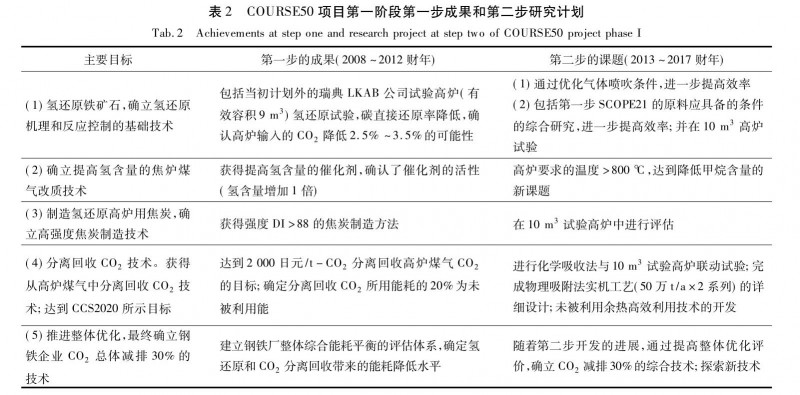 目前,COURSE50 項(xiàng)目研究處于第一階段的第二步。第一階段的研究成果以及第二步研究計(jì)劃如表 2 所示[34]。2014 年 9 月,在君津廠開工建設(shè) 10m3 試驗(yàn)高爐( 產(chǎn)量35 t/d) ,進(jìn)行工業(yè)試驗(yàn)及研究。2015 年 10 月,該試驗(yàn)高爐進(jìn)行熱試運(yùn)轉(zhuǎn)。2016 年開始進(jìn)行 2 年的操作試驗(yàn),研究向高爐噴吹還原氣體方法的最佳化和適合氫還原的原燃料條件等,并與CO2分離回收試驗(yàn)設(shè)備( CAT1、CAT30) 進(jìn)行同步試驗(yàn),在 2017 年確立 CO2 減排 30%的目標(biāo)技術(shù)。