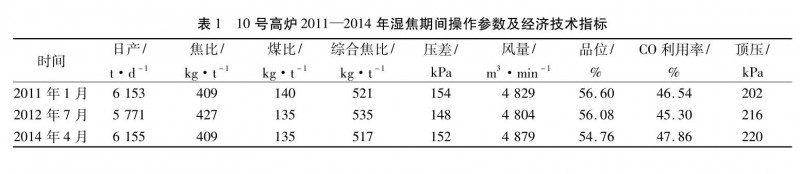 10 號高爐在使用 6 m 焦爐生產(chǎn)的濕焦初期,爐缸粉焦增加,中心氣流明顯減弱,爐溫偏高,壓差明顯上升,鐵水黏稠且流動性變差,爐前出鐵卡焦頻繁,鐵口來風(fēng)早,出鐵不暢,爐內(nèi)下料受阻,導(dǎo)致爐溫升高且形成惡性循環(huán)。