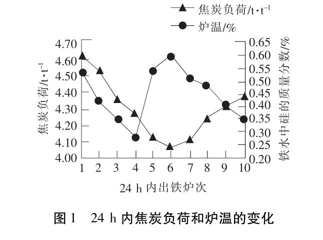 濕法熄焦時,打水時間一般為 105 ~110 s,焦炭負荷由正常時的 4. 72 t/t 下降到 4. 06 t/t。由于焦炭水分大幅度波動,因此很難找到基準焦炭負荷,導(dǎo)致高爐爐溫波動較大,鐵水中硅的質(zhì)量分數(shù)標準偏差由 0. 053 上 升 至 0. 064,平均硅質(zhì)量分數(shù)由0. 39%上升至 0. 44%,且高爐溫現(xiàn)象較多。使用濕焦期間24 h內(nèi)高爐焦炭負荷及爐溫變化見圖 1。