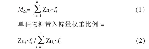 高爐入爐原燃料包括燒結(jié)礦、球團礦、塊礦、焦炭、煤粉等。 根據(jù)高爐入爐原燃料的含鋅量及各物料對應的噸鐵單耗,可以在計算鋅負荷的同時,確定鋅的主要來源物料。 鋅負荷及單種物料帶入鋅量權(quán)重比例的計算公式如下: