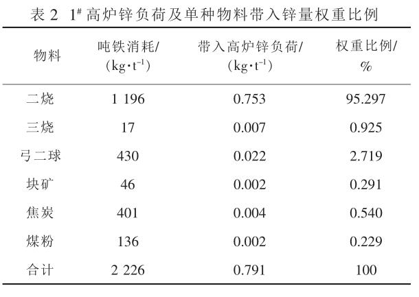 表 2 為煉鐵總廠1 # 高爐鋅負荷及單種物料帶入鋅量權(quán)重比例。由表2可以看出,1 # 高爐中的鋅約有 96% 是由燒結(jié)礦帶入, 其余物料帶入的鋅量均較少。 同時,從實際化驗結(jié)果可知,球團、塊礦含鋅均極低(低于 0.005% 的檢測下限),焦炭和煤粉含鋅也極少,且球團、塊礦和燃料帶入高爐的鋅量基本固定。 故 1 # 高爐中鋅主要來源于燒結(jié)礦。
