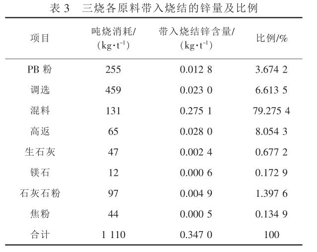 進一步對燒結(jié)工序進行鋅負荷統(tǒng)計分析。表 3為三燒各原料帶入燒結(jié)的鋅量及比例。 由表 3 可以看出, 三燒燒結(jié)礦中的鋅約有 79% 是由混料帶入,由于鐵礦、熔劑含鋅均按 0.005% 計算 ( 化驗值 <0.005%) , 因此實際由混料帶入鋅的比例應該更高。 同時,從實際化驗結(jié)果可知,煉鐵總廠使用的鐵礦原料中,除了關(guān)寶山精礦含鋅 0.006% ,其余鐵礦原料含鋅均低于 0.005% 的檢測下限,且熔劑(生石灰、石灰石、鎂石)基本不含鋅,燃料含鋅也極少。 故三燒燒結(jié)礦中的鋅主要來源于混料。