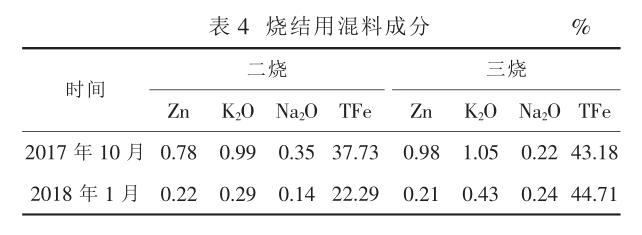 2017 年 10 月和 2018 年 1 月的二燒、 三燒燒結(jié)用混料成分見表 4 , 可以看出混料成分不穩(wěn)定,含鋅量波動大。