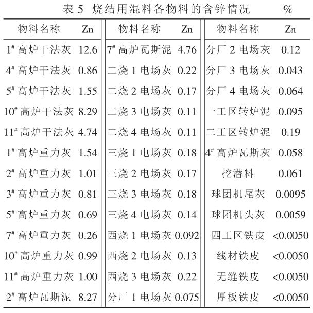 由于煉鐵總廠的燒結(jié)工序中, 僅東燒不使用塵泥混料,含鋅 <0.005% ,其余各燒結(jié)工序燒結(jié)配料情況基本相同, 因此煉鐵總廠燒結(jié)礦中的鋅主要來源于混料。
